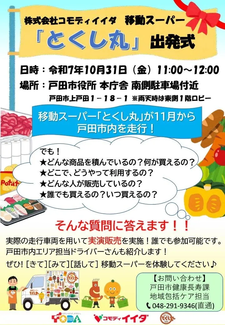 10月31日(金)午前11時から正午まで、戸田市役所南側駐車場で出発式が行われました。雨天の場合は、戸田市役所の東側ロビーでの開催となります。当日は、戸田市長の菅原文仁氏、株式会社コモディイイダの取締役である齊藤健志氏が挨拶を行い、移動スーパー「とくし丸」の詳細が説明されました。