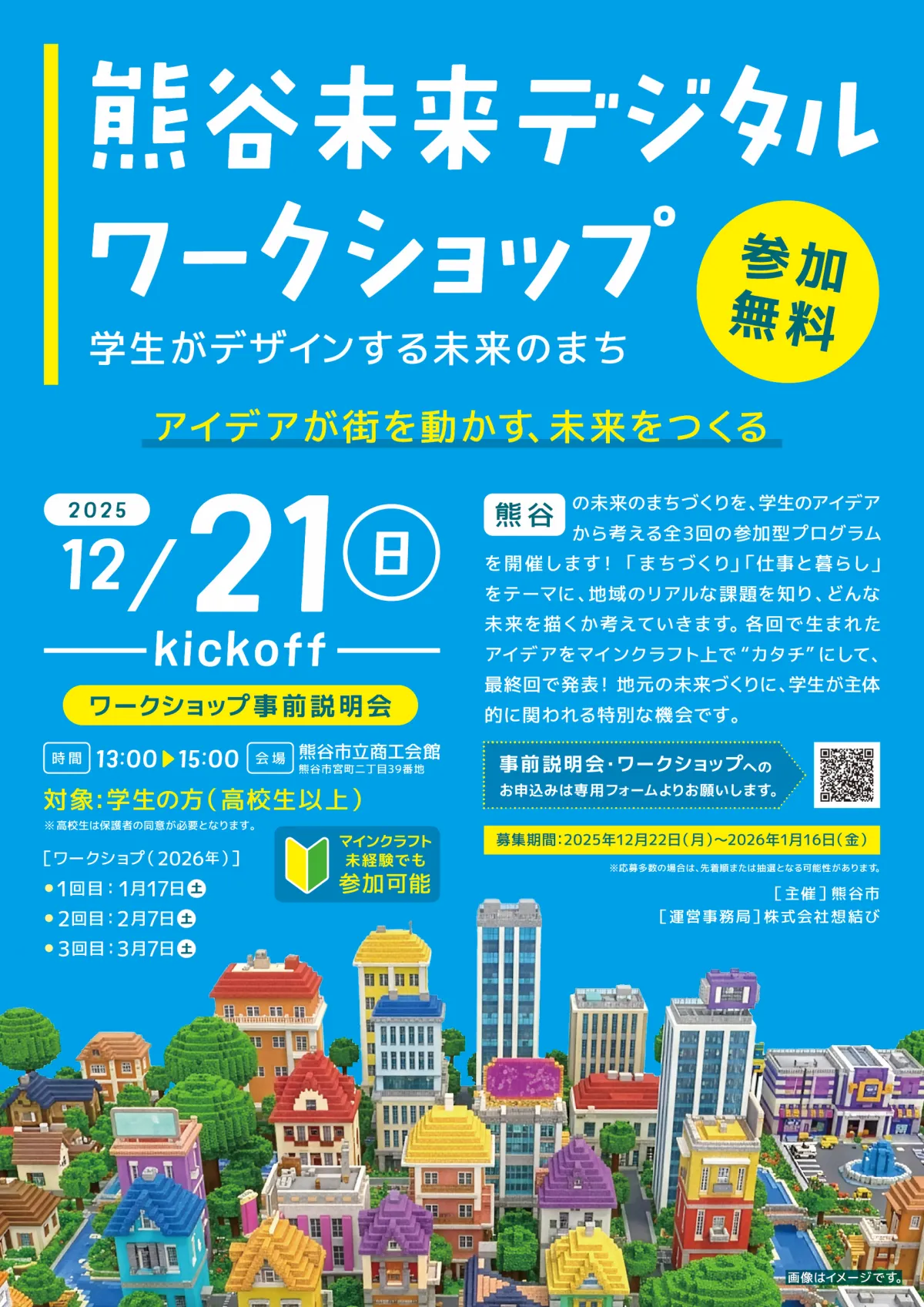 埼玉県熊谷市で、次世代を担う学生たちが人気ゲーム「マインクラフト」を利用し、理想の街を描く「熊谷未来デジタルワークショップ」が開催されます。この取り組みは、地域課題の解決や未来像のデザインを目的とした参加型のプログラムです。