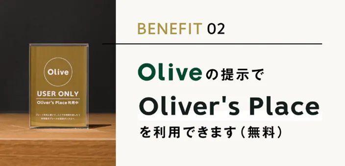 2つ目は、専用スペース「Oliver's Place」の利用。こちらは「Olive」アカウント契約者専用のリラックス空間であり、環境に配慮したインテリアとともに、おくつろぎいただけます。