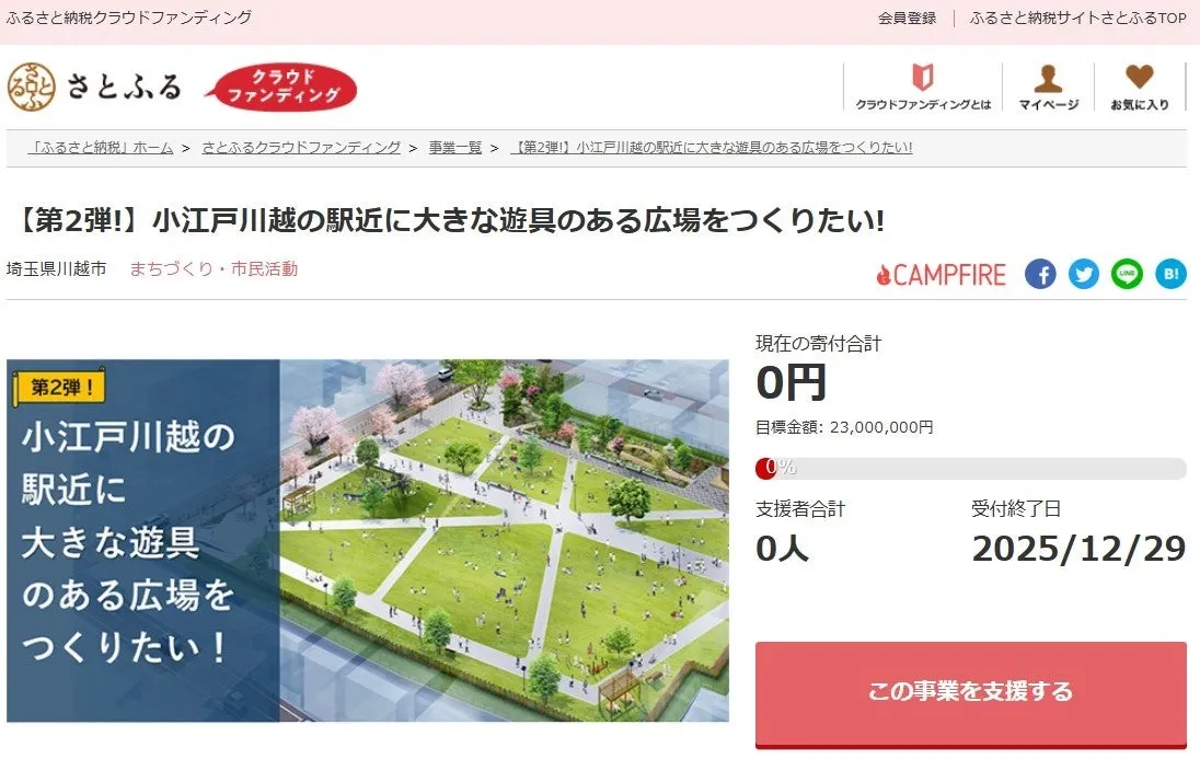 このプロジェクトの名称は「【第2弾!】小江戸川越の駅近に大きな遊具のある広場をつくりたい!」で、目標寄付額は2300万円に設定されています。寄付の受付は2025年9月22日から2025年12月29日まで行われます。この寄付は、地域の子供たちにより良い遊び場を提供するための重要な資金となります。