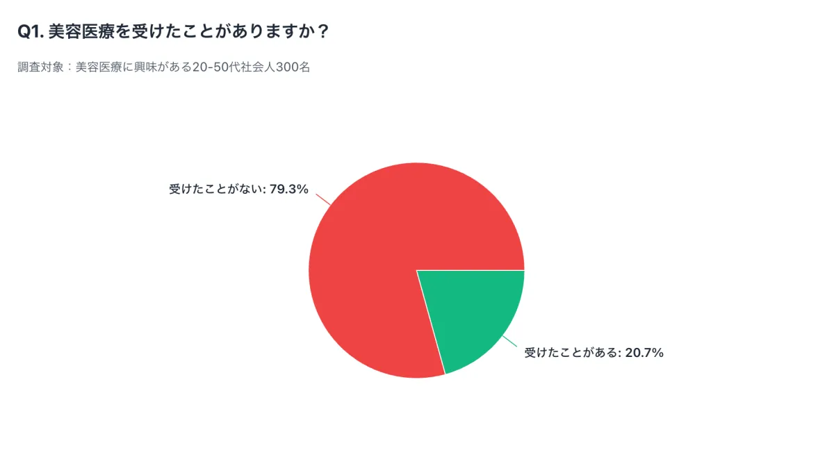 医療法人社団鉄結会が2025年10月に実施した調査では、美容医療に興味がある全国の20-50代の社会人男女300名を対象に、「踏み切れない理由」や今後受けたい施術について調査が行われました。調査方法はインターネットで、約8割の方が施術未経験者という結果となりました。