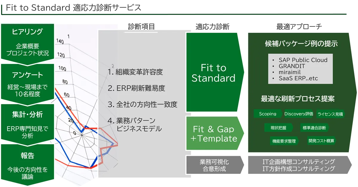 近年、多くの企業が基幹システムの刷新に際し、「Fit to Standard」という考え方を取り入れています。ただし、このアプローチを成功させるには、組織がどれだけ変革に対応できるか、また関係者間での意見の一致が不可欠です。この新しい診断サービスは、各関係者の考えや課題を整理し、「Fit to Standard」でのプロジェクト推進における障害の有無や、それに適したIT導入の方法を検討します。