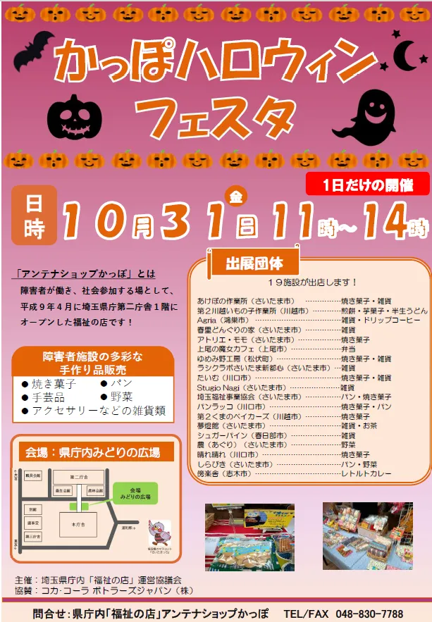 今年のハロウィンは、埼玉県庁内のみどりの広場で、心温まる「かっぽ」ハロウィンフェスタを家族や友人と一緒に楽しんでください!その目で、耳で、そして味覚で、福祉の力強いメッセージを感じ取ってみましょう。楽しみにお待ちしております!