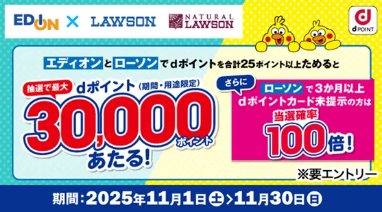 株式会社NTTドコモは、2025年11月1日から11月30日までの期間、エディオンおよびローソン(ナチュラルローソン含む)で「抽選でdポイント最大30,000ポイントが当たるキャンペーン」を展開します。このキャンペーンに参加するには、事前にエントリーが必要です。エントリーはキャンペーンサイトから簡単に行えます。