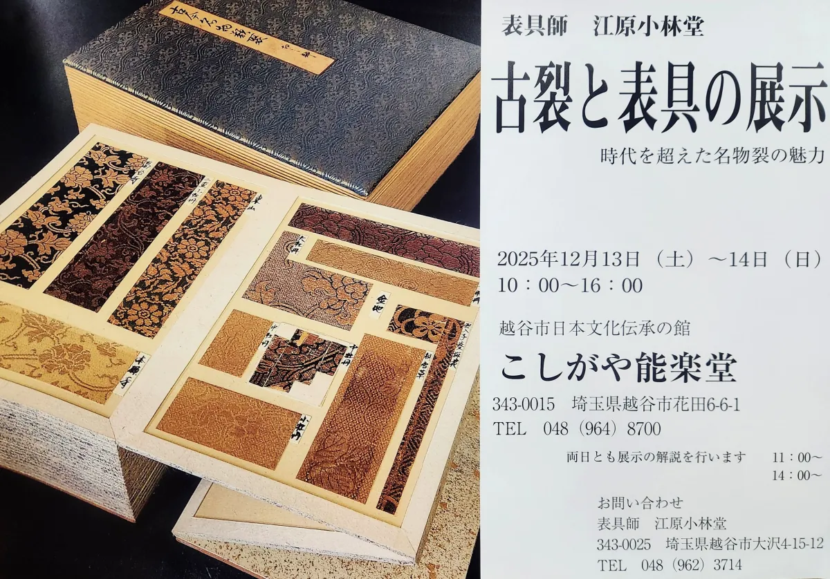 イメージ豊かな古裂を肌で感じられる展示が、令和7年12月13日(土)と14日(日)の二日間、越谷市のこしがや能楽堂にて開催されます。このイベントは、地元の表具師である江原小林堂の江原望代表が手掛けるもので、入場は無料となっています。