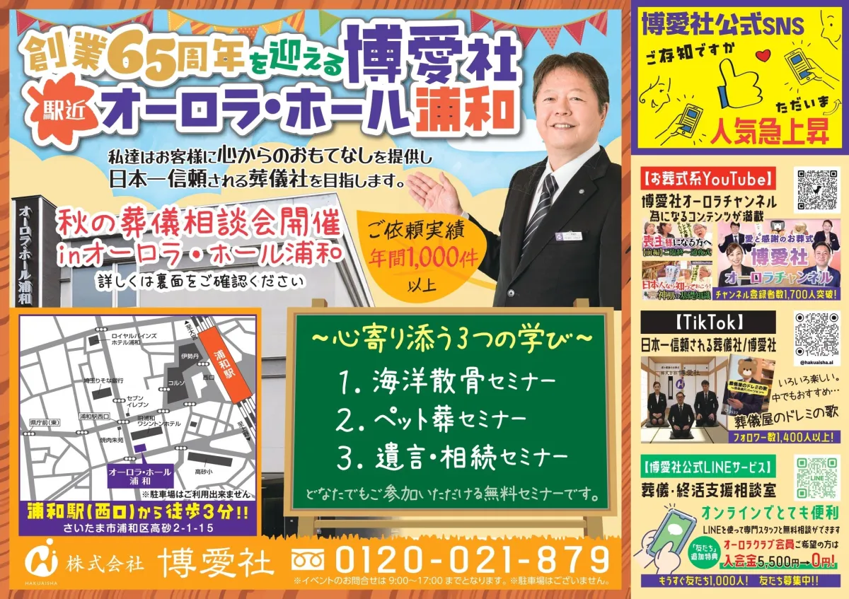 埼玉県浦和市で、葬儀社として65年の歴史を持つ博愛社が「秋の葬儀相談会」を開催します。このイベントは、葬儀に関する常識を変える新たな試みで、終活を「暗い話ではなく、家族を守るための前向きなステップ」と捉えています。