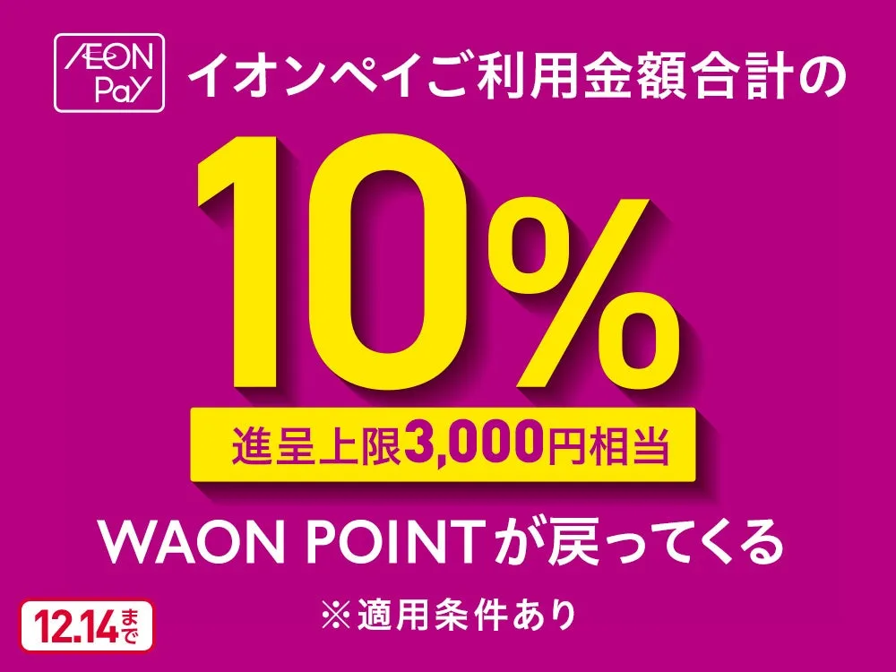 - - 還元内容: 期間中にAEON Payで支払いをすると、10%分をWAONポイントで還元