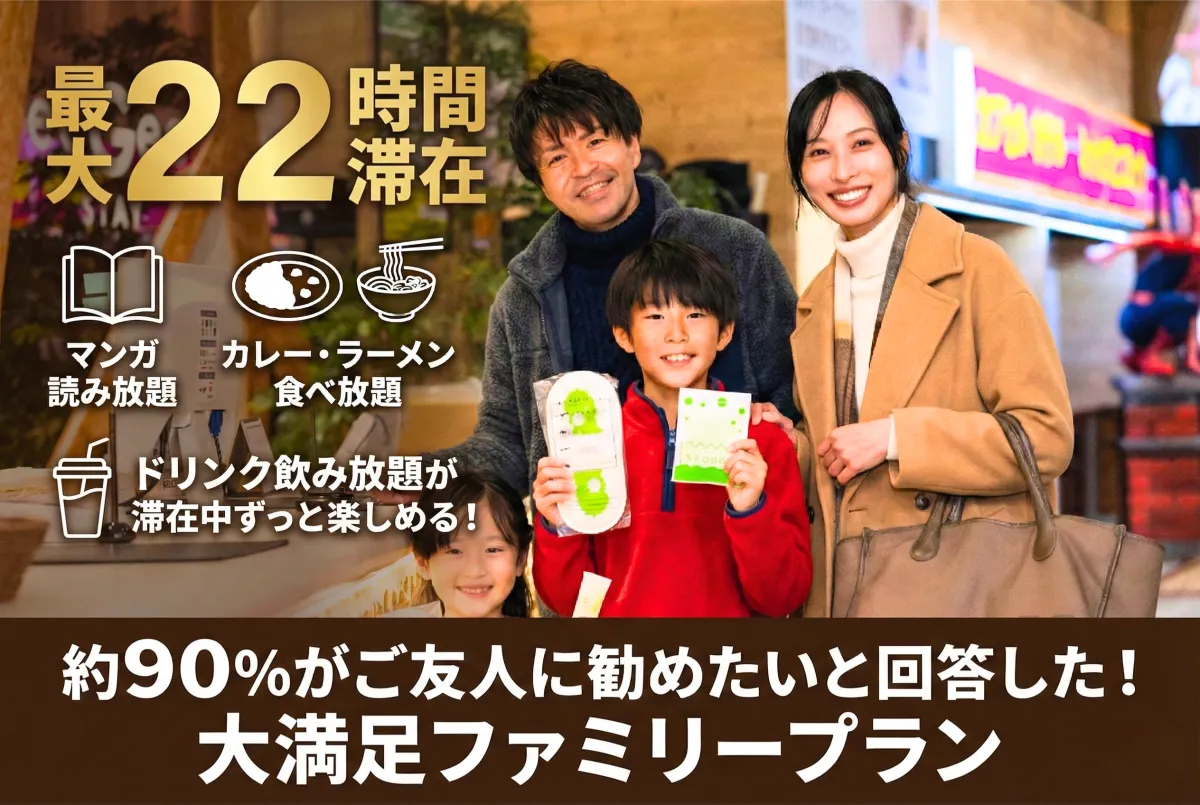 多種多様な食べ飲み放題のメニューに加え、豊富なコミックコーナーやPCで映画鑑賞ができるネットカフェエリアも完備。ボードゲームの貸出や、お子様向けのお菓子のつかみ取りイベントも行います。さらに、子供用アメニティやDHCスキンケアグッズなど、家族みんなが嬉しい細やかな配慮もたくさん用意されています。