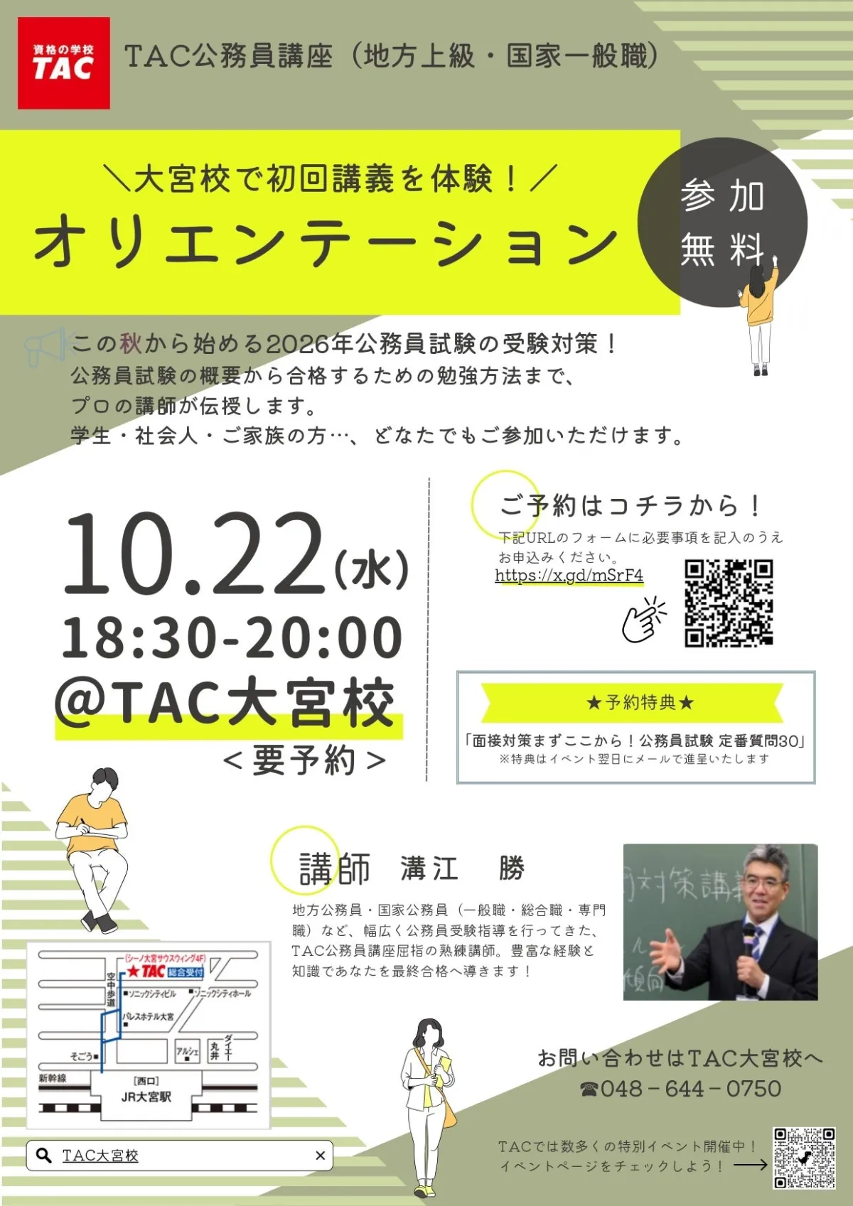 2025年10月22日(水)、TAC大宮校にて「初回講義を体験!2026合格目標 公務員試験オリエンテーション」が行われます。公務員試験を目指す方々に向けたこのセミナーは、受験対策の基本や勉強法をプロの講師から直接学べる貴重な機会です。