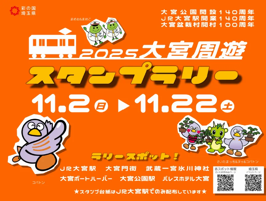 今回のイベントのメインの一つが、「大宮周遊スタンプラリー」です。このスタンプラリーは埼玉県とさいたま市が共同で実施しており、さらにJR東日本の大宮支社も協力しています。開催期間は、2025年11月2日(日)から11月22日(土)まで。大宮公園を中心に、大宮の魅力を発信するために設定されたスタンプ台が6か所があります。