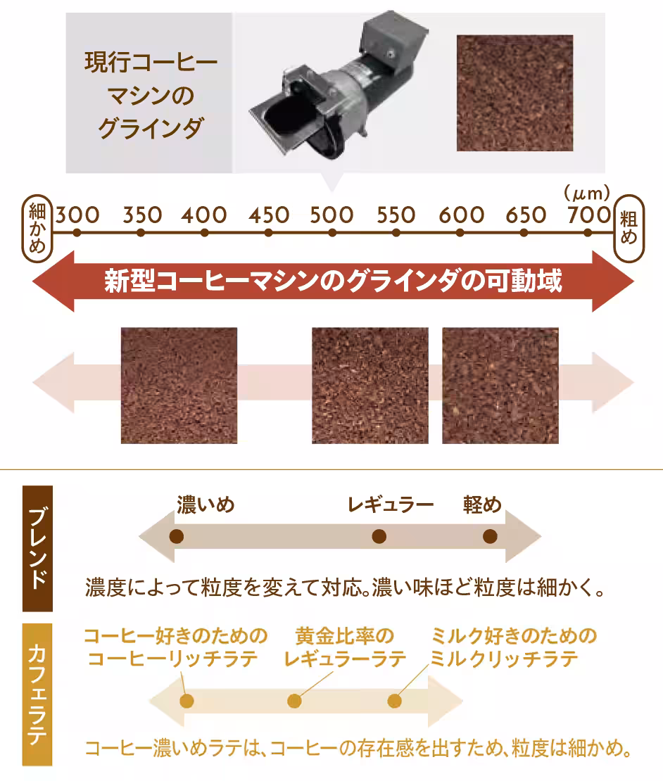 新型コーヒーマシンの特筆すべき特徴は、業界初となる挽き方調整グラインダーの搭載です。この機能により、豆の挽き目を9段階に調整することができ、メニューごとに最適な粒度でコーヒーを提供できます。つまり、専門店のような味わいを実現することが可能になったのです。