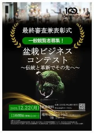 埼玉県さいたま市で開催される「盆栽ビジネスコンテスト~伝統と革新でその先へ~」が、12月22日(月)に最終審査と表彰式を迎えます。このイベントは、世界に名を馳せる大宮盆栽の文化を守り続けるため、次世代に向けて新たな価値を提供するビジネスプランのアイデアを募るものです。