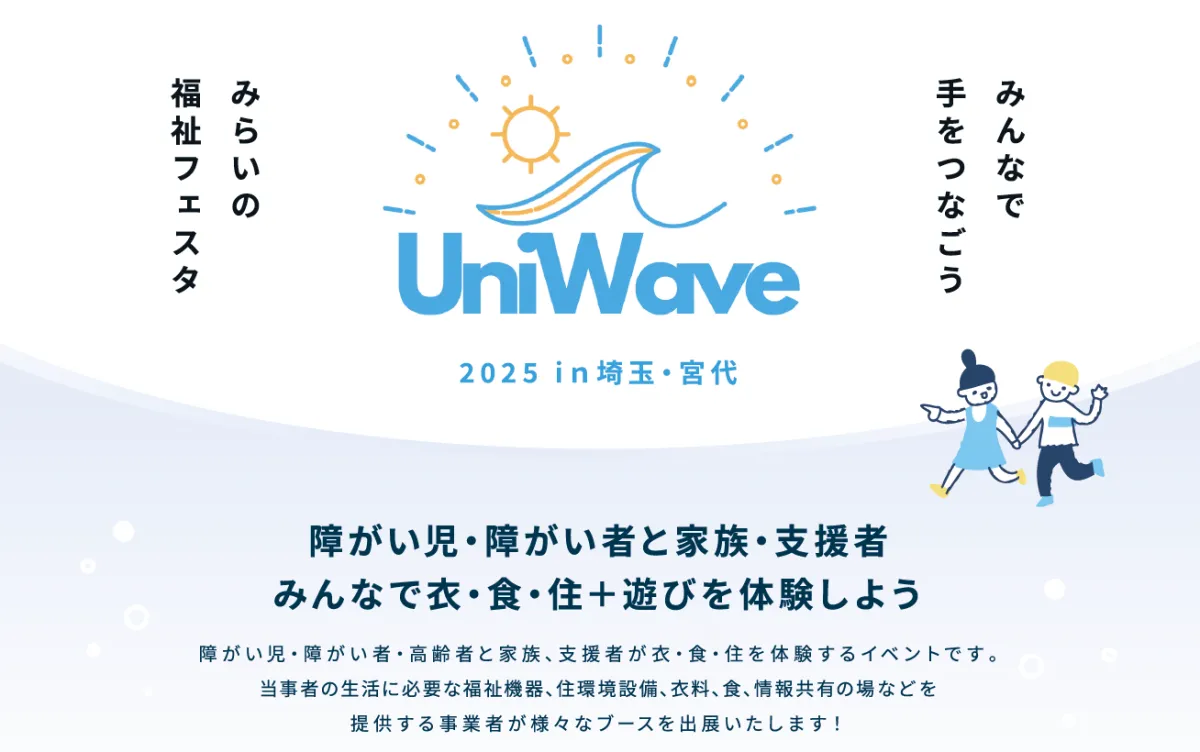 「UniWave」というイベント名は「Universal Wave(普遍の波)」を意味し、共生社会実現に向けた新たな動きを表現しています。この波が埼玉から全国へと広がり、福祉の新しい潮流を創出することを目指します。